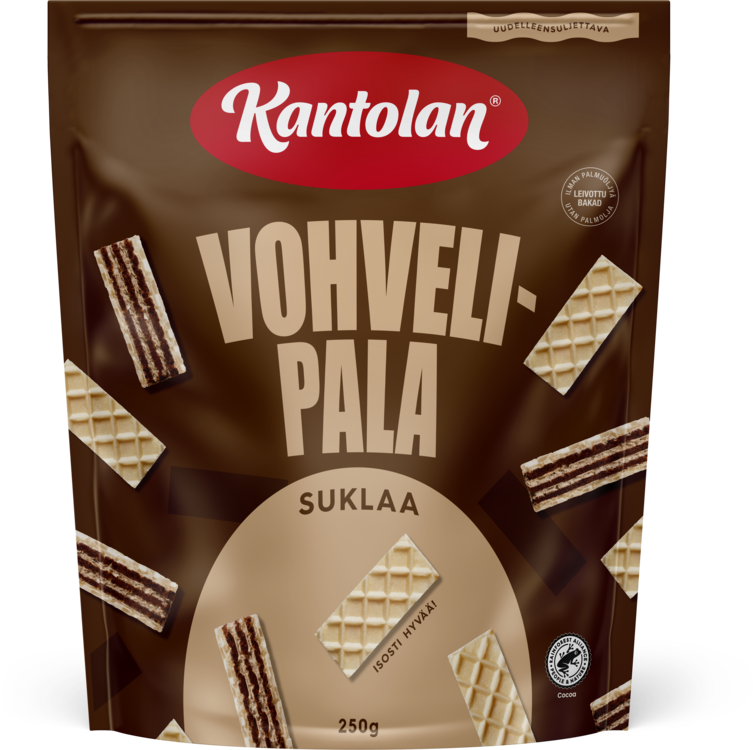 Kantolan Vohvelipalat ovat ihanan nostalgisia ja kesäisiä suupaloja. Rapeat ja kuorruttamattomat vohvelipalat on täytetty suussa sulavalla täytteellä. Suuresta pussista riittää jaettavaksi kaikille herkkusuille ja tuote sopiikin viemisiksi kesämökille tai juhliin tarjottavaksi. Pussi on myös uudelleensuljettava, mikä säilyttää herkullisen rapeuden. Kaksi herkullista makua, suklaa ja metsämansikka. Vegaaninen. Palmuöljytön.